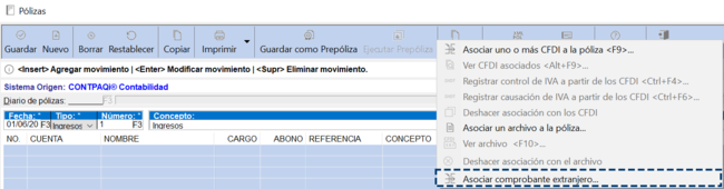 Al registrar la póliza, haz clic en ADD y selecciona Asociar comprobante extranjero.