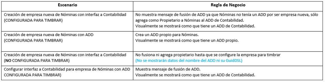 A partir de esta versión de CONTPAQi® Nóminas, al realizar la interfaz de una empresa nueva de Nóminas, que se acaba de habilitar para la emisión de recibos, pero que aún no se guardan los cambios y por lo tanto aún no tiene un ADD propio, con una empresa de CONTPAQi® Contabilidad, se mostrará el mensaje de fusión de ADD. Y el ADD que se asignará a la empresa de Nóminas será el de CONTPAQi® Contabilidad.