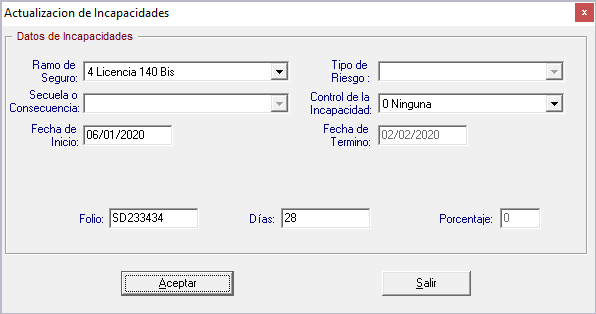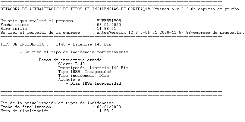 A partir esta versión 12.3.0 de CONTPAQi® Nóminas el catálogo de tipo de incidencias contiene la nueva incapacidad por “Licencia 140 Bis”.