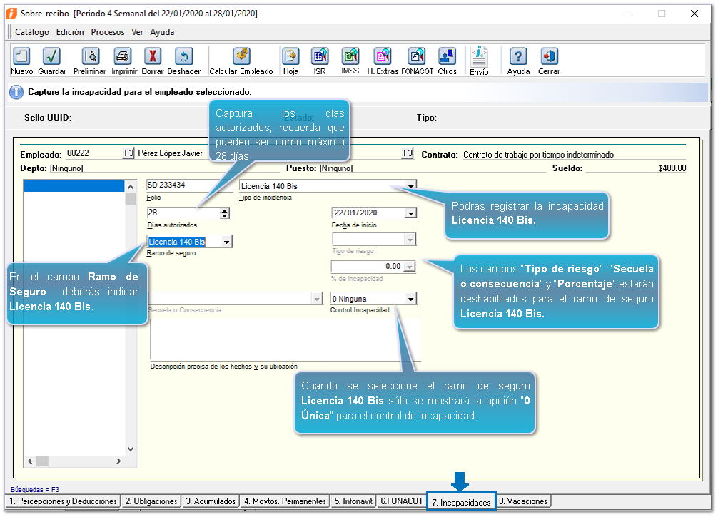 Las tarjetas de incapacidad se capturan desde el sobre-recibo, dentro de la pestaña 7.Incapacidades: