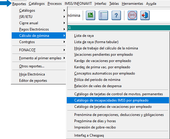 Puedes ejecutarlo desde el menú Reportes / Cálculo de la Nómina / Catálogo de incapacidades IMSS por Empleado: