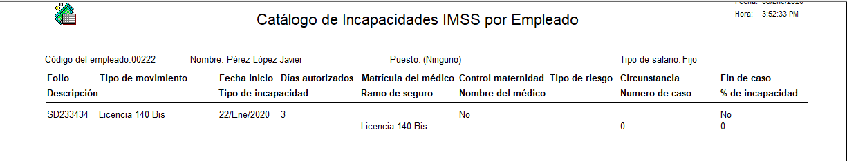 2. En el reporte Catálogo de incapacidades IMSS por Empleado se muestra la información del nuevo tipo de incapacidad.