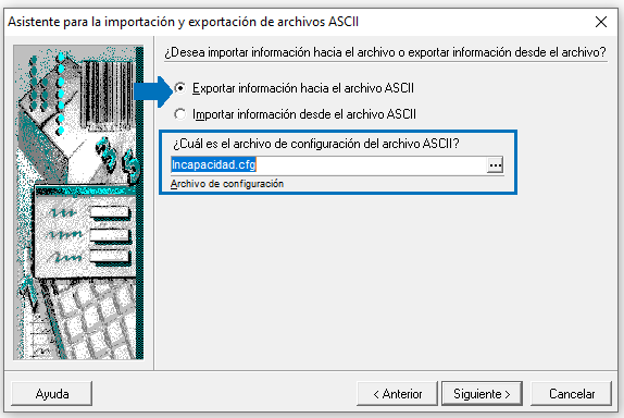 2. En el asistente, dejamos configurada la opción Exportar información y elegimos el archivo Incapacidad.cfg:
