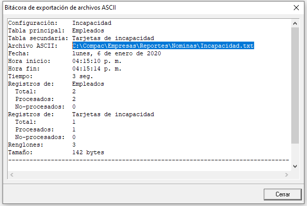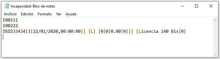 4. Al abrir el archivo txt que se generó podrás identificar que se exportó correctamente la tarjeta de incapacidades para el ramo Licencia 140 Bis:
