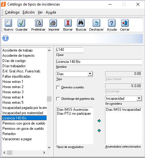 A partir de esta versión 12.3.0 de CONTPAQi® Nóminas, se incluye el nuevo tipo de incidencia Licencia 140 Bis.