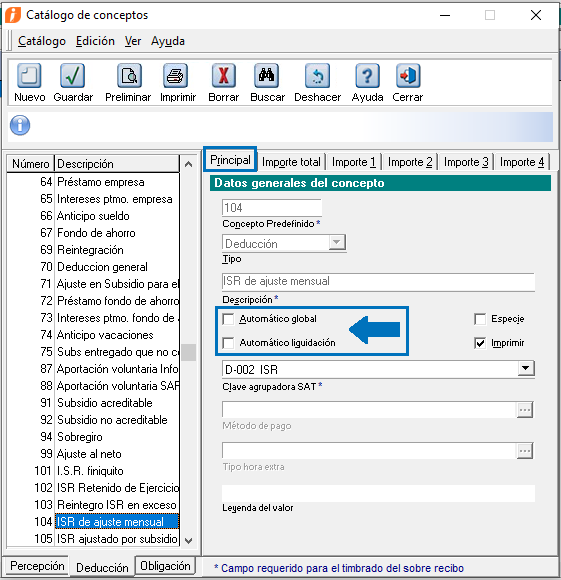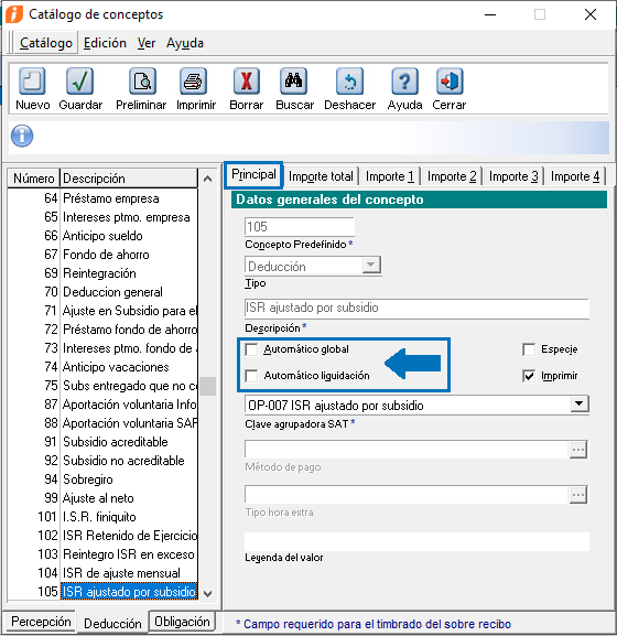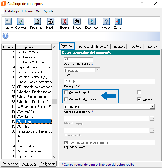 Para deshabilitar el cálculo de otros conceptos que pudieran ocasionar un cálculo incorrecto en el ISR, es necesario configurarlos desmarcando los parámetros de automático global y automático liquidación.