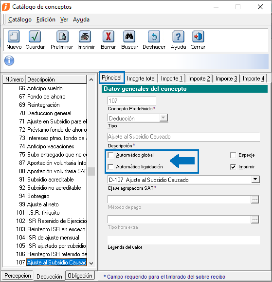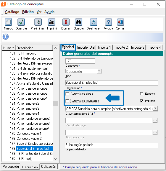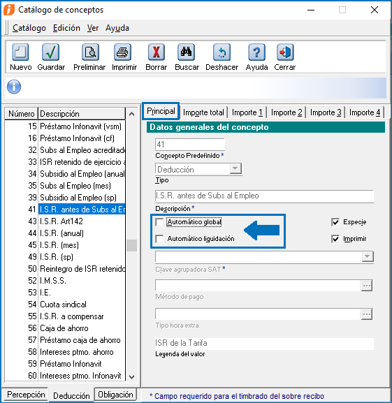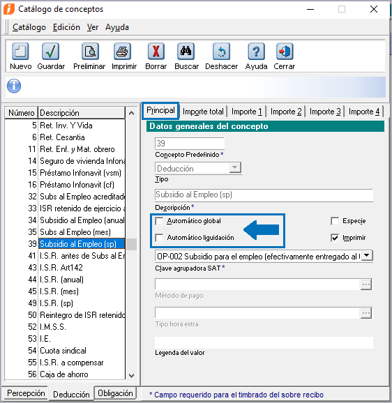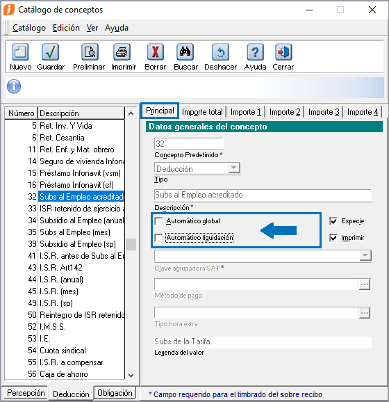 3. Desmarca las casillas "Automático global" y "Automático liquidación", dentro dela pestaña "Principal" para los siguientes conceptos de Deducción: