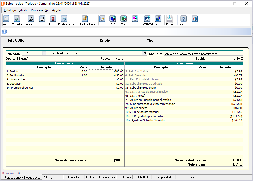Y para el ejemplo, en el sobre-recibo del periodo 4 existen movimientos para los conceptos de ajuste: D105 que tiene la clave SAT OP007 y el concepto D75 con la clave SAT OP008.