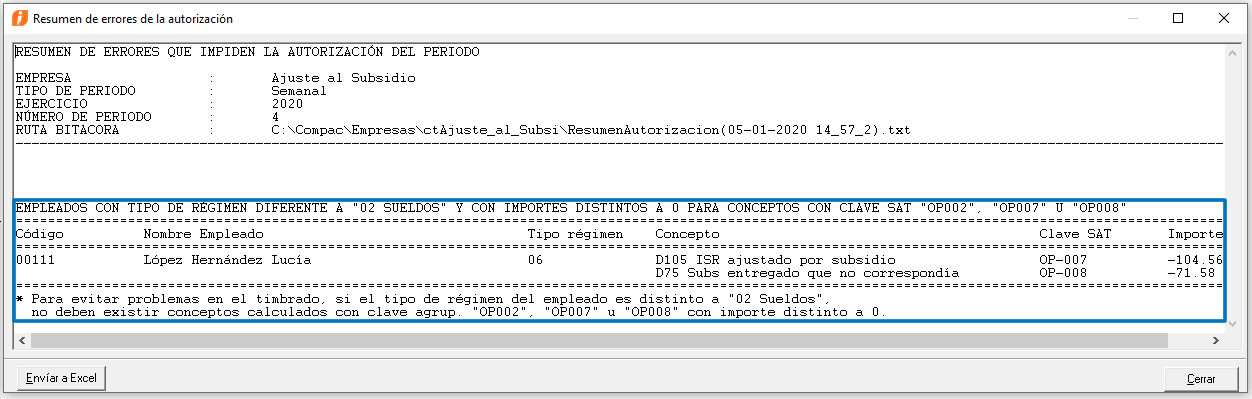 Si no realizas la configuración para el cálculo de asimilados a salarios, o la configuración no fuera correcta, en caso de incluir conceptos relacionados con el subsidio en el recibo de un empleado con tipo de régimen de Asimilados a Salarios, el sistema no te permitirá la autorización y te notificará la inconsistencia.