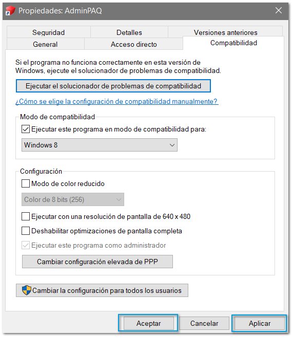 Habilitar la opción "Ejecutar como administrador" en los sistemas comerciales