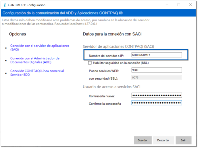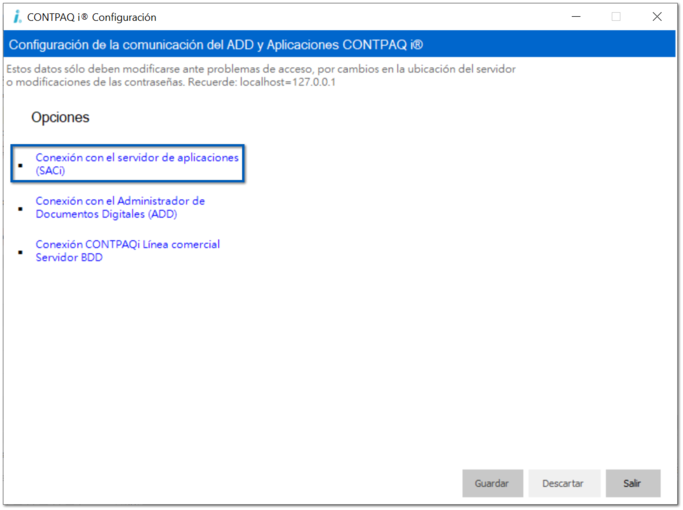 Dentro de CONTPAQi Configuración selecciona la opción Conexión con el servidor de aplicaciones (SACi).