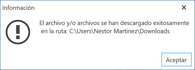 Una vez que termine, se indicará en el siguiente mensaje: "El archivo y/o archivos se han descargado exitosamente en la ruta: C:\Users\Nombre_de_usario\Downloads". Acepta el mensaje.