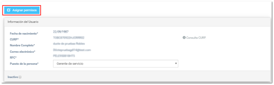Ingresa al usuario y presiona el botón Asignar permisos.