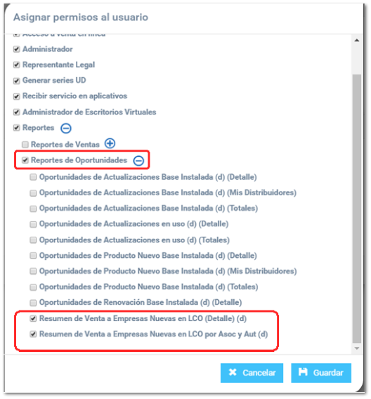 Selecciona la opción Reportes y ejecuta Reportes de Oportunidades. Se desplegará la lista de los reportes a fin de agregarle los permisos a cada usuario.