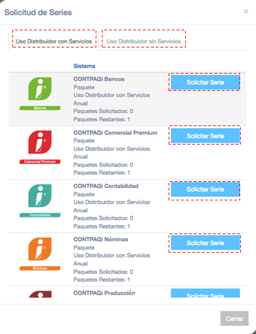 Los distribuidores podrán solicitar series de tipo “Uso Distribuidor Con Servicios” y “Uso Distribuidor sin servicios” y de manera inmediata podrán disponer de las series solicitadas; en la ventana donde se solicitan este tipo de series se muestra el total de series disponibles a solicitar; las series siempre nacen pre-registradas a la empresa del distribuidor que solicita y el contacto es el usuario que la solicitó.