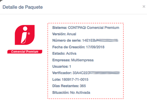 Al generar una serie se puede ver el detalle de dicha serie, el detalle muestra los datos necesarios para activarla, así como sus características.