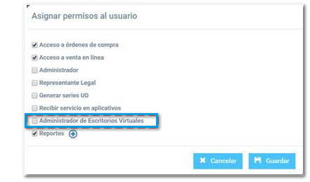 Los usuarios con perfil administrador podrán otorgar el permiso a los usuarios que requieran ver la opción "administrador de escritorios virtuales".