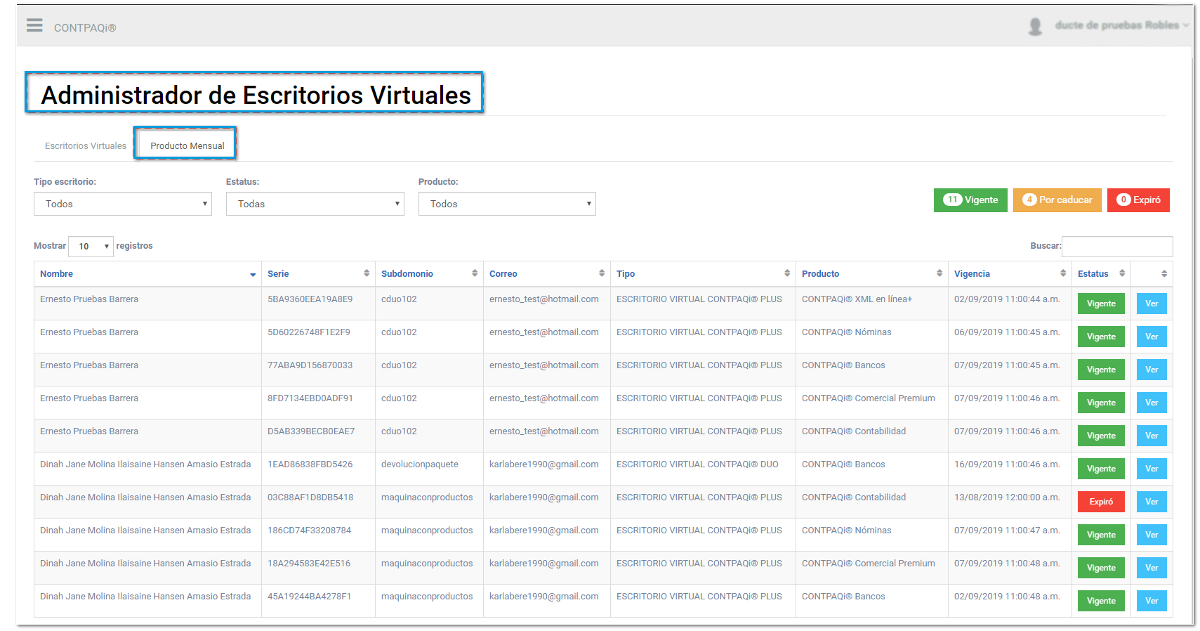 Esta pestaña nos ayudará mostrandonos un listado de los sistemas CONTPAQi® adquiridos con licencia mensual, para los escritorios virtuales.