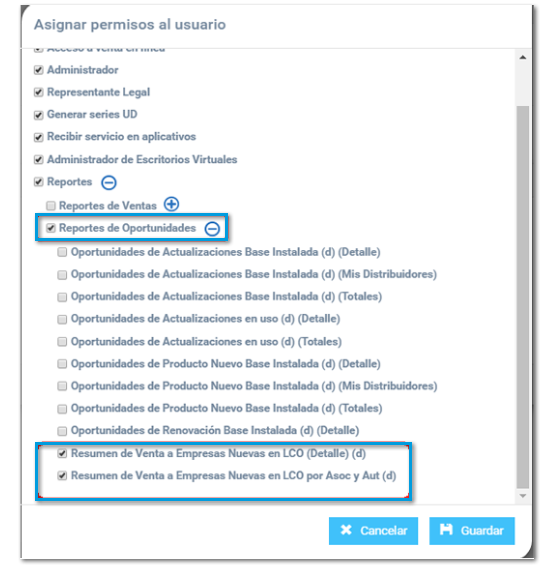 Selecciona la opción Reportes y ejecuta Reportes de Oportunidades. Se desplegará la lista de los reportes a fin de agregarle los permisos a cada usuario.