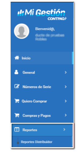 De esta manera, se podrá ingresar a los reportes habilitados en el apartado de permisos. Para validarlo, ingresa al menú Reportes, opción Reportes Distribuidor.