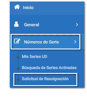 Dentro de Mi Gestión, ve al menú Números de Serie y selecciona Solicitud de Reasignación.