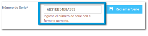 Verifica que el número de serie capturado sea correcto, ya que de lo contrario se mostrará el mensaje: "Ingrese el número de serie con el formato correcto".