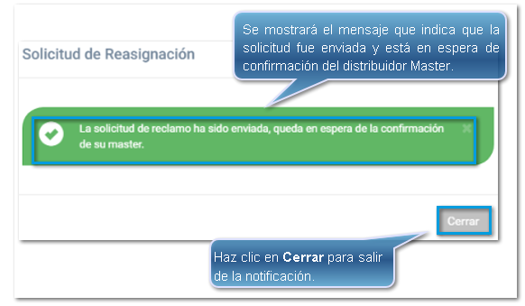 Se mostrará el mensaje: "La solicitud de reclamo ha sido enviada, queda en espera de la confirmación de su master." que indica que estará en espera de que el distribuidor Master Apruebe o Rechace la solicitud.