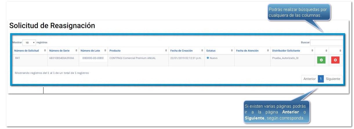 Dentro del menú Números de series se agrega la opción Solicitud de Reasignación, desde la cual los distribuidores Asociados y Autorizados podrán hacer la solicitud de reasignación de series a su distribuidor Master; asi mismo los distribuidores Master podrán Aprobar o Rechazar las solicitudes de reasignación de series de los distribuidores Asociados o Autorizados.