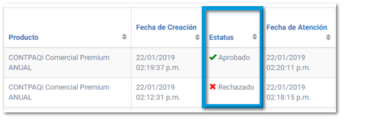 Los estatus Aprobado y Rechazado se mostrarán de la siguiente manera: