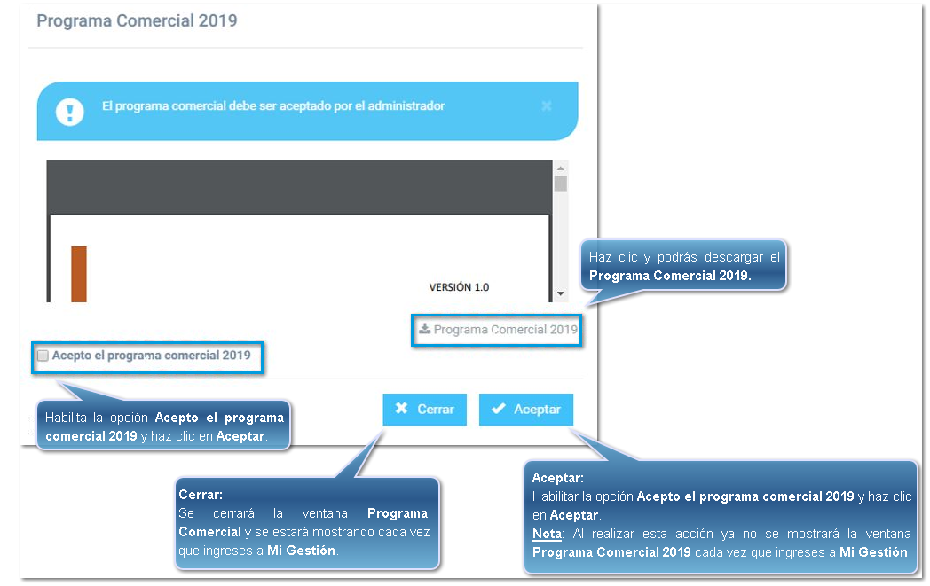 Al ingresar a Mi Gestión se mostrará la ventana Programa Comercial, te recomendamos leerlo y aceptarlo: