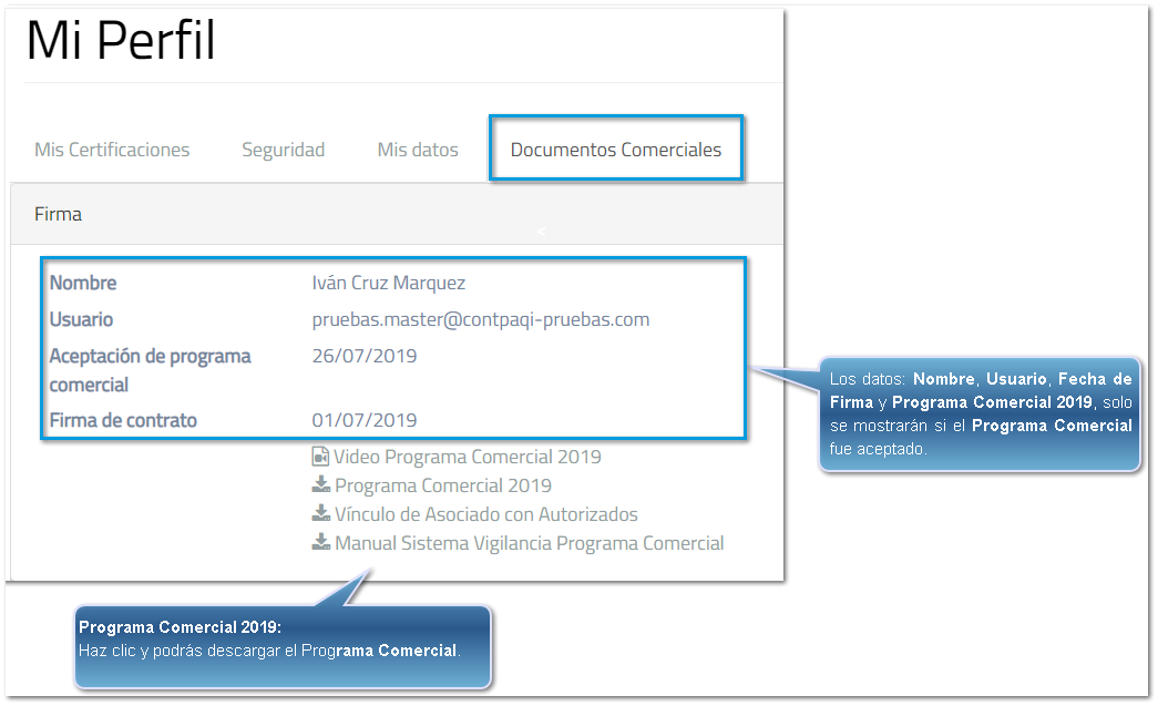 Si el Programa Comercial no ha sido aceptado, no se mostrara información en el : Nombre, Usuario y Fecha de Firma.