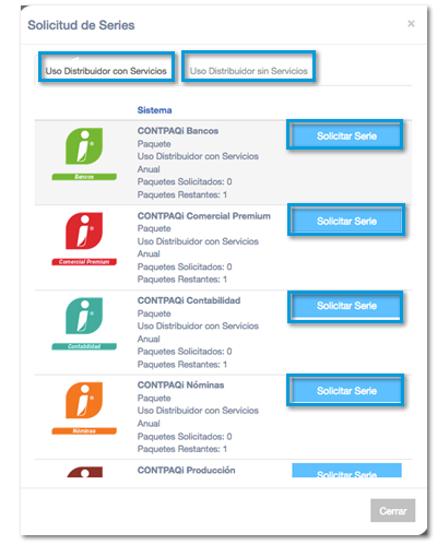 Los distribuidores podrán solicitar series de tipo “Uso Distribuidor Con Servicios” y “Uso Distribuidor sin servicios” y de manera inmediata podrán disponer de las series solicitadas; en la ventana donde se solicitan este tipo de series se muestra el total de series disponibles a solicitar; las series siempre nacen pre-registradas a la empresa del distribuidor que solicita y el contacto es el usuario que la solicitó.