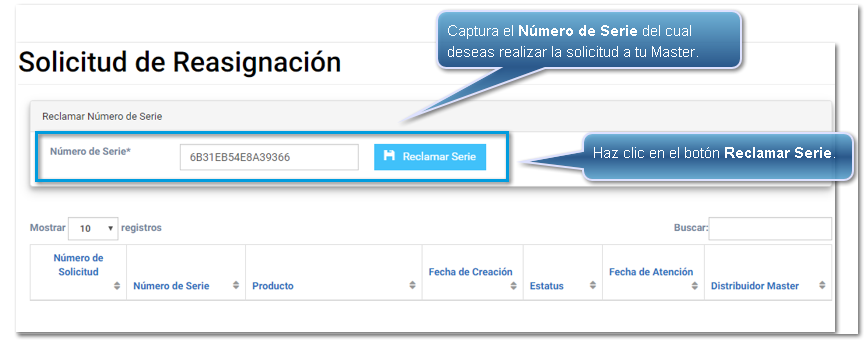 En la parte derecha, se mostrará el apartado de Solicitud de Reasignación, y podrás capturar el Número de Serie y realizar la solicitud.