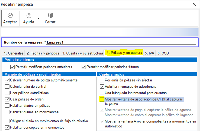 Selecciona Pólizas y su captura, y deshabilita la casilla mostrar ventana de asociación de CFDI al capturar la póliza:
