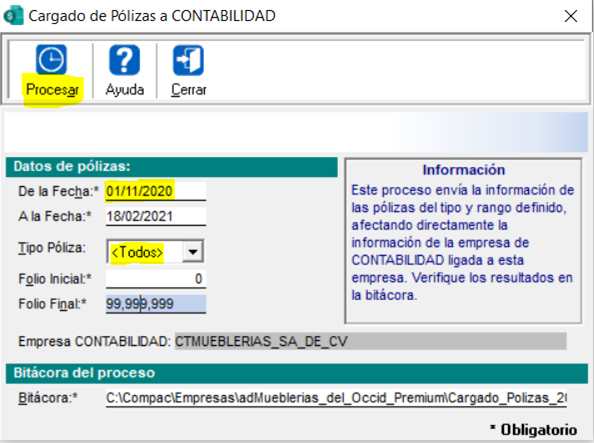 Cargado de pólizas a CONTABILIDAD.