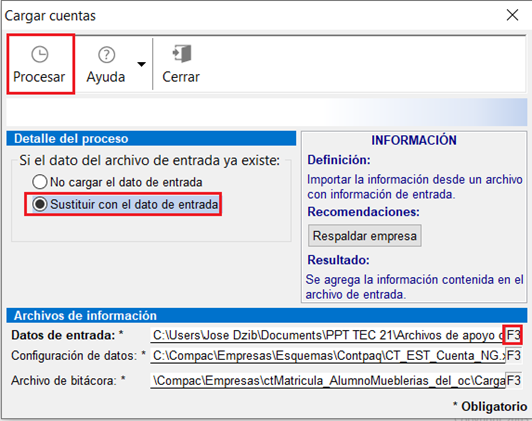 En el campo dato de entrada, oprime la tecla F3 y localiza la ruta donde descargaste el archivo Cargar_catálogo_cuentas.txt.