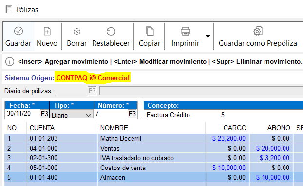 Observa que al abrir la póliza muestra como sistema origen CONTPAQi® Comercial.