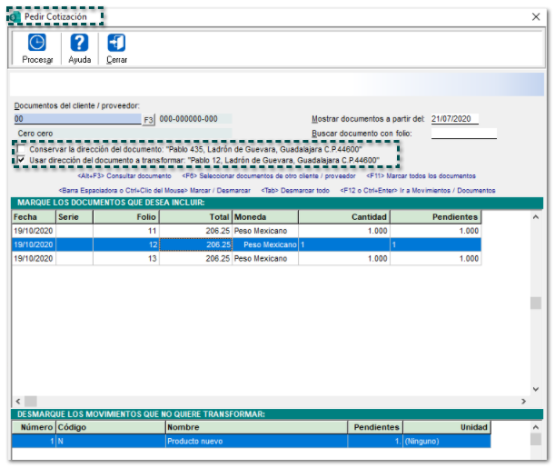 Podrás elegir cuál dirección se usará, solo si el documento destino no tiene movimientos capturados y se transforme un solo documento a la vez.