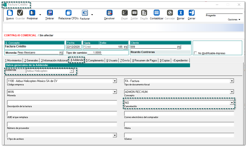 A partir de esta versión, se incluye el campo "Cancelación" a nivel Documento en la Addenda Airbus Helicopters, para que se muestren los nodos <R:Cancelaciones> y <R:CancelaSustituye UUID=" "> de manera correcta en el XML.
