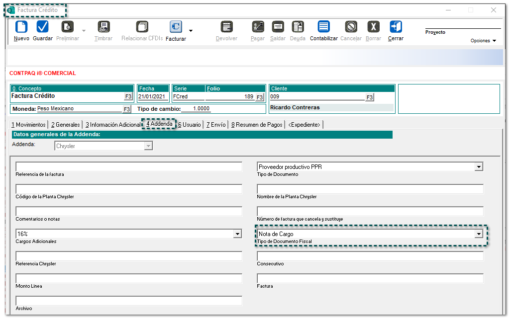 se podrá seleccionar la opción "Nota de Cargo" en el campo