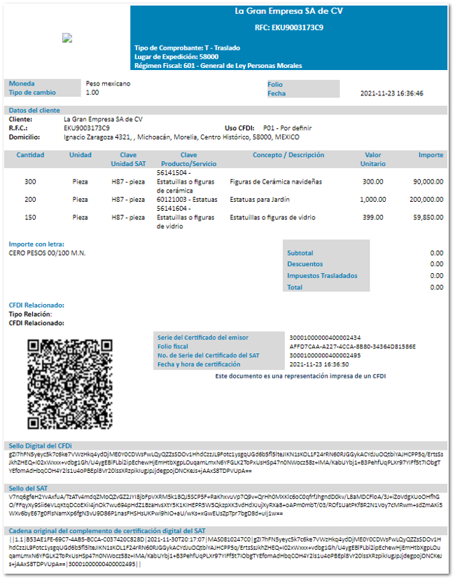 Información general del documento CFDI de Traslado:
