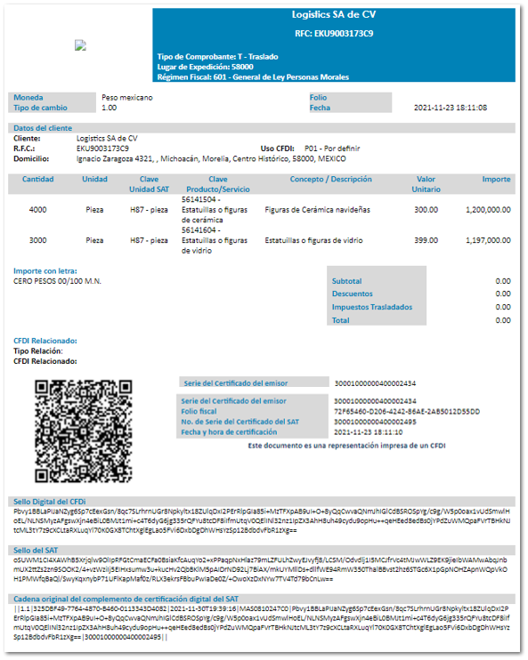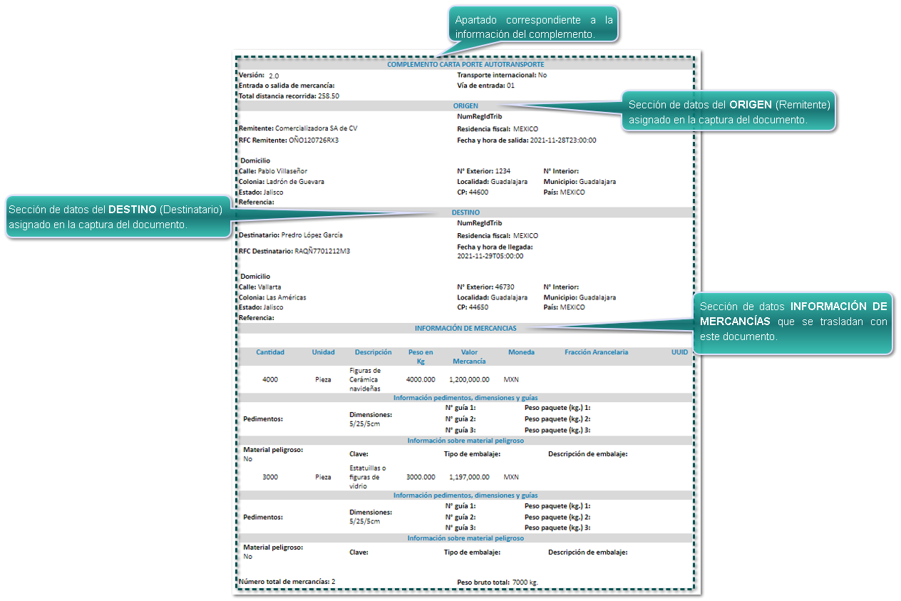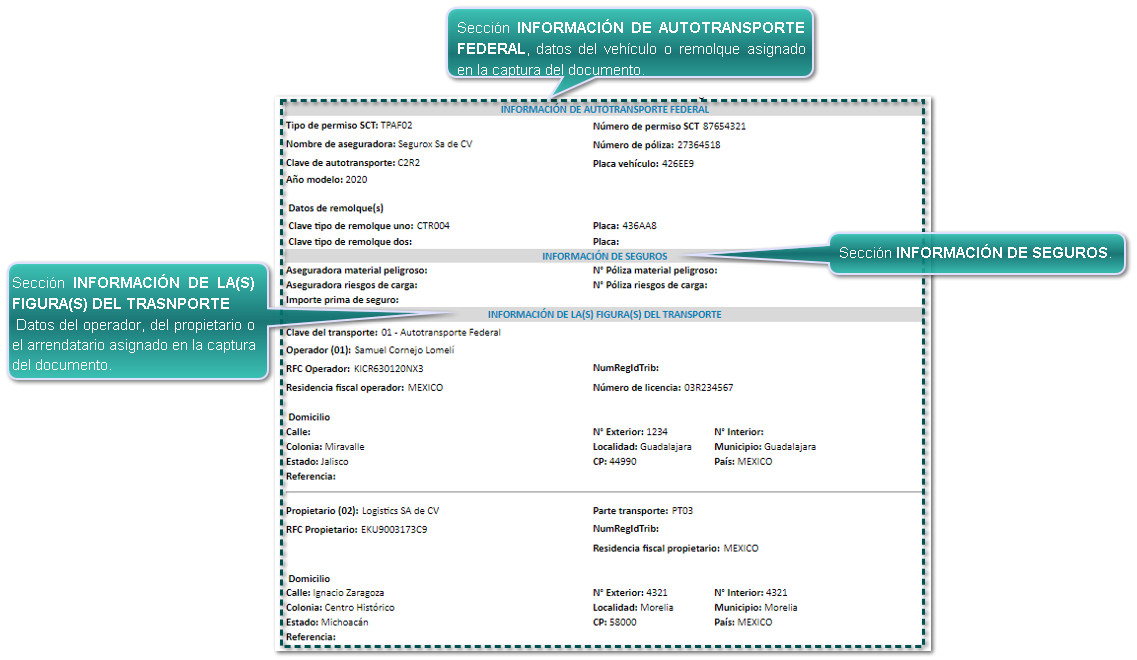 Ejemplo del Formato de impresión para un documento de Carta Porte (Traslado) emitido por el intermediario, en el que se muestra la información del complemento Carta Porte Autotransporte Federal.