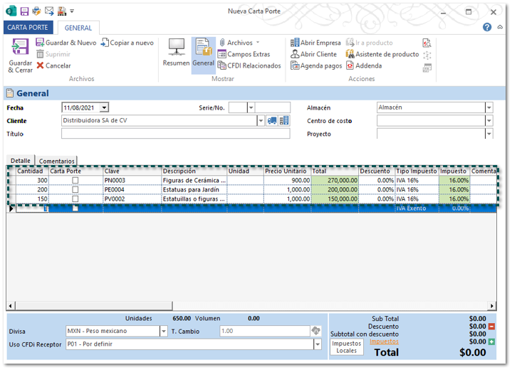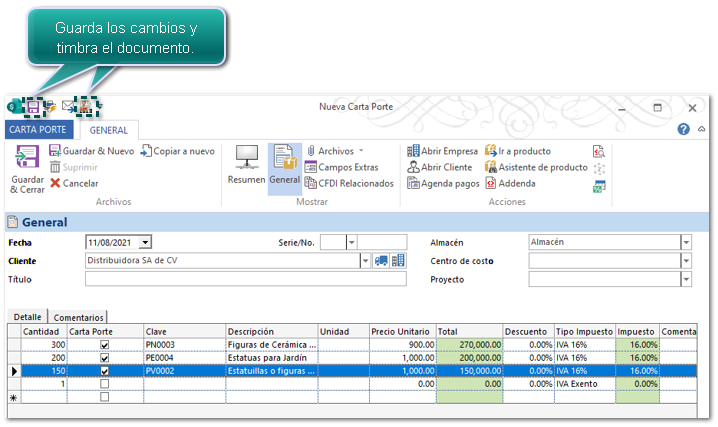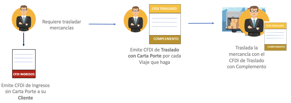 Posteriormente debe generar y timbrar un documento de Carta Porte (Traslado) con el Complemento Carta Porte en el que se indique la mercancía a trasladar.