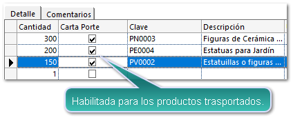 El documento cuenta con la columna Carta Porte, por default se muestra deshabilitada en todos los movimientos, y deberás habilitar los movimientos cuando se trate de los productos que serán transportados por el servicio del propietario, de esta forma se incluirán dentro del apartado del Complemento carta Porte.