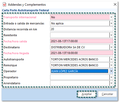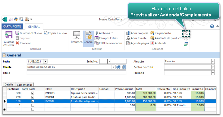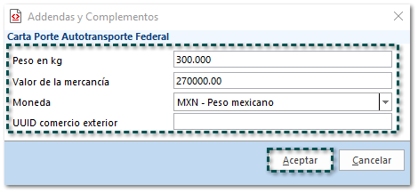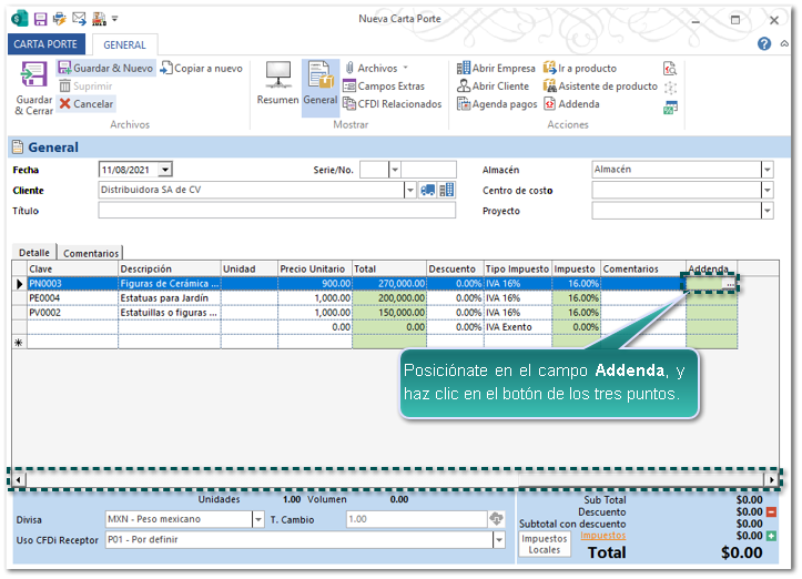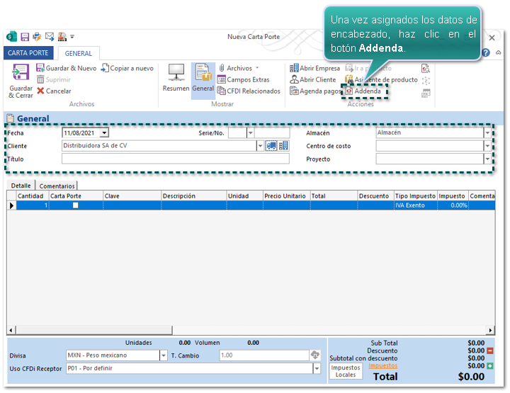 Dentro del documento Carta Porte captura los datos de encabezado; y posteriormente haz clic en el botón Addenda.