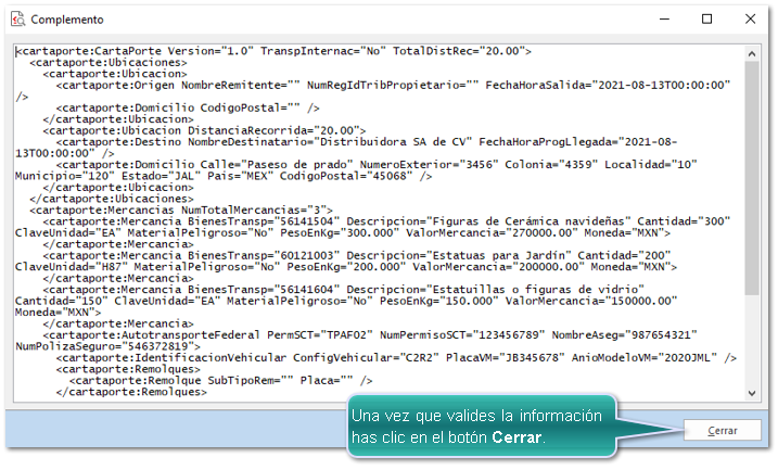 Se mostrará la siguiente ventana para que puedas visualizar la información del complemento en formato XML, antes de realizar el timbrado.
