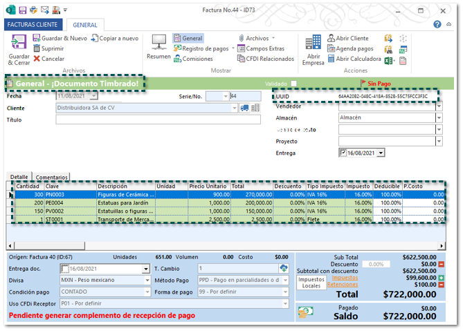 La Gran Empresa SA de CV genera y timbra un documento de Facturas Cliente (Ingreso), por la venta realizada a la empresa Distribuidora SA de CV.