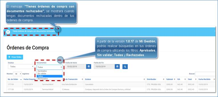 CONTPAQi® a través de su departamento de Tesorería realiza la validación de los documentos. Si alguno de los documentos no fue aprobado, en la ventana de Órdenes de compra se mostrará el siguiente mensaje: