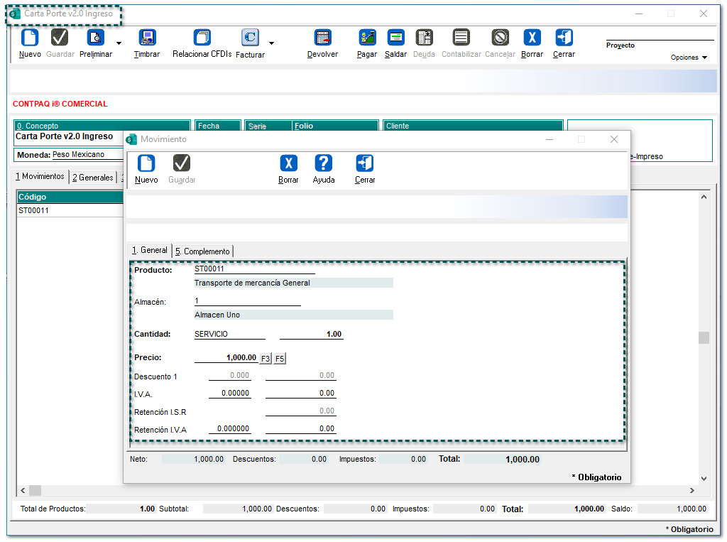 Genera la factura de tipo Ingreso con el servicio de transporte de mercancía con IVA al 0% y Retención de IVA al 0%: