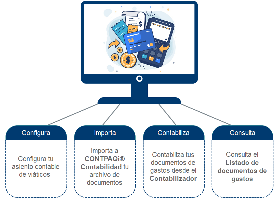 La siguiente imagen muestra de forma general las acciones a seguir para contabilizar los documentos de viáticos en CONTPAQi® Contabilidad: